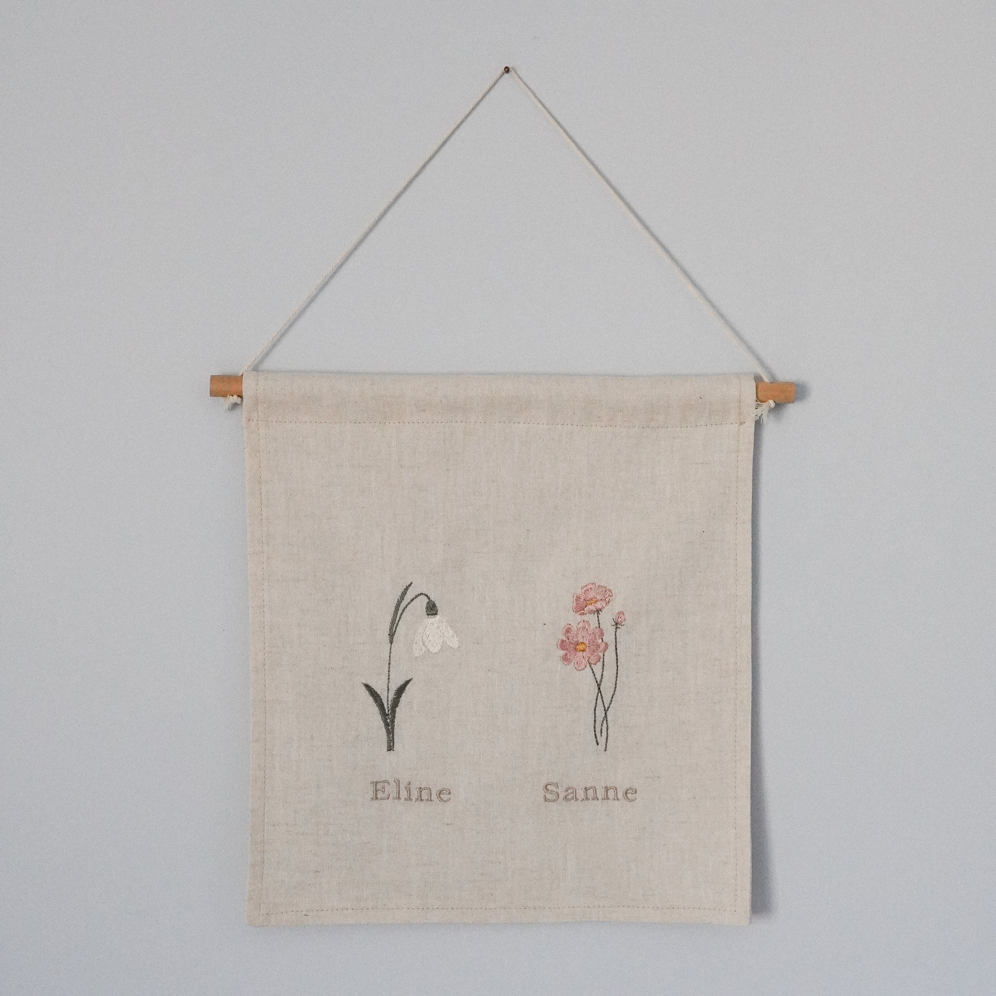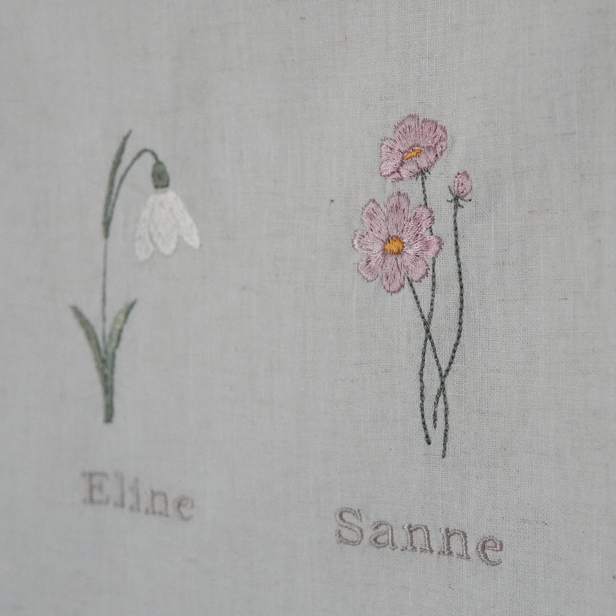 Onze 'birthflower banner' wordt met zorg door ons met de hand gemaakt en voorzien van fijne borduurdetails. Kies één geboortebloem en naam voor een subtiel en persoonlijk accent, of combineer meerdere bloemen en namen om een heel gezin vast te leggen.