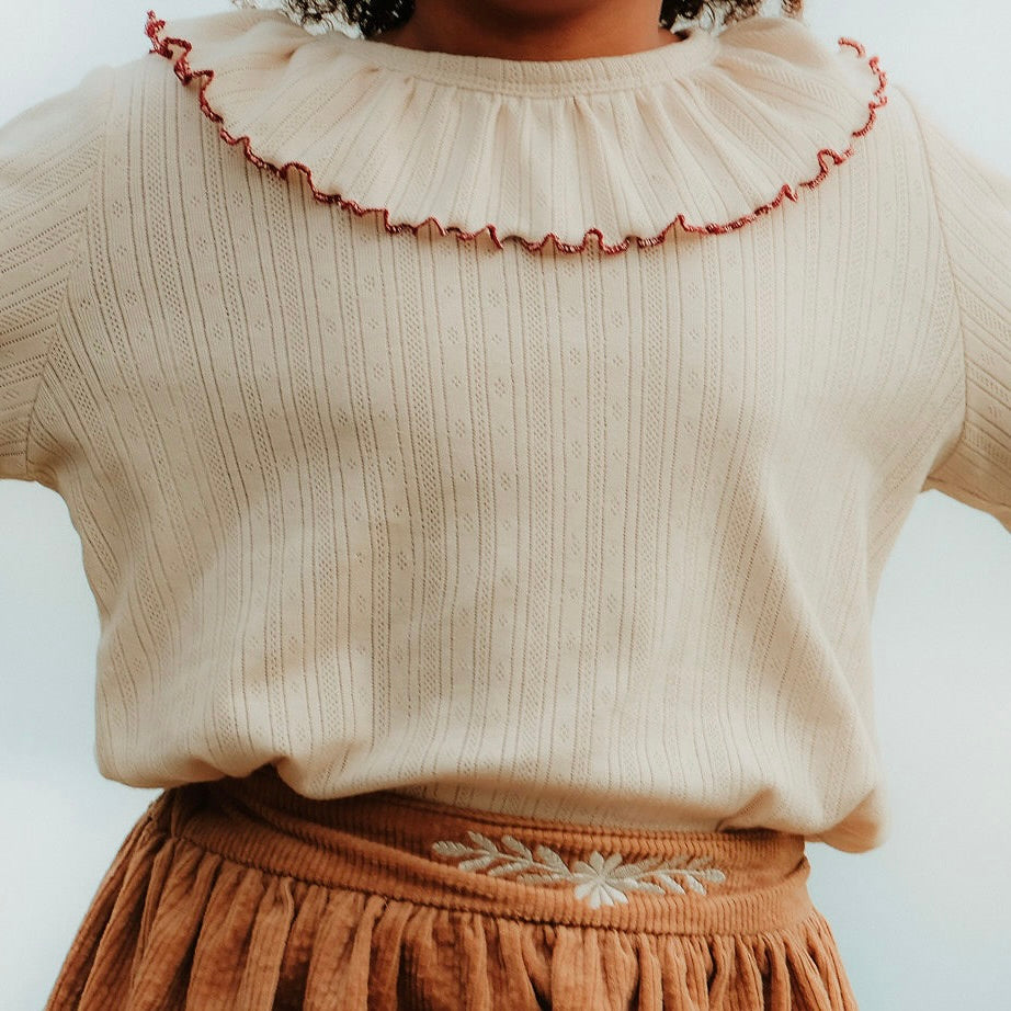 Geïnspireerd op de Zweedse traditie St. Lucia, welke vreugde en licht brengt. Onze Lucia top, een prachtige top gemaakt van pointelle stof afgewerkt met een ruche kraag en elastische manchetten met ruches.